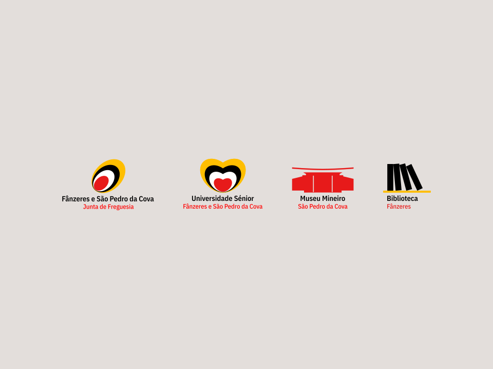 Variantes da cor da logomarca da Junta de Freguesia e de outras logomarcas associadas à Junta de Freguesia (Biblioteca de Fânzeres, Museu Mineiro, Universidade Sénior de Fânzeres e São Pedro da Cova aqui