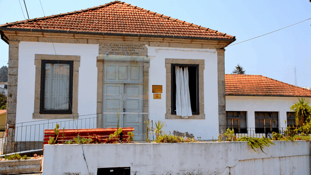 Na fachada mantem a inscrição original “Casa de instrução primária da freguesia de São Pedro da Cova, feita por iniciativa de Manuel Alves Vieira e José Martins de Castro, em 1881”.