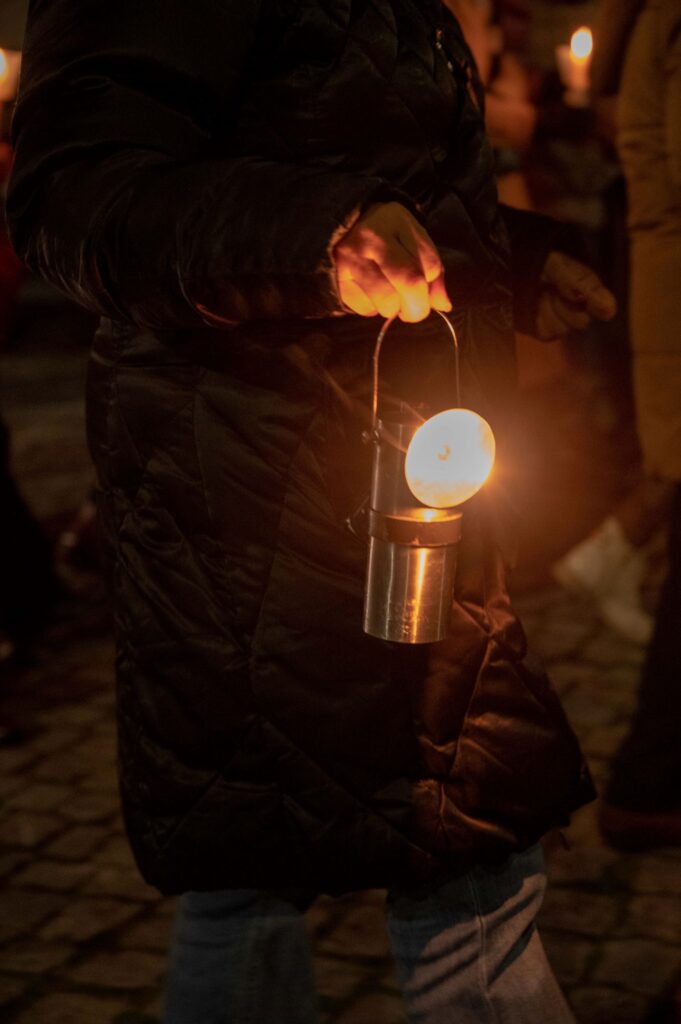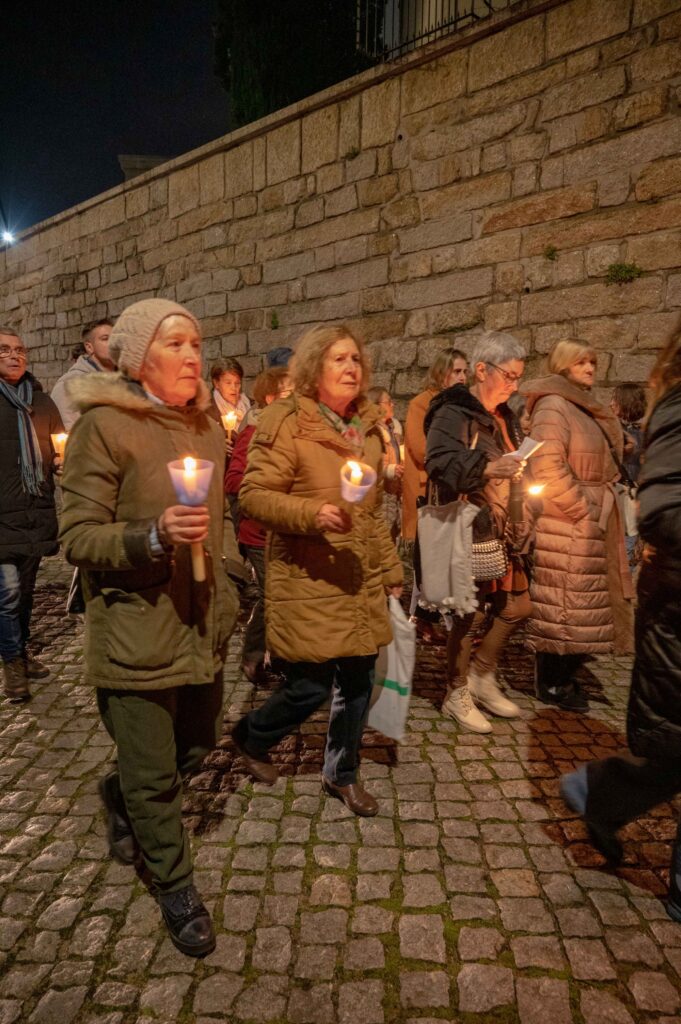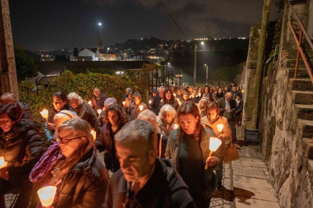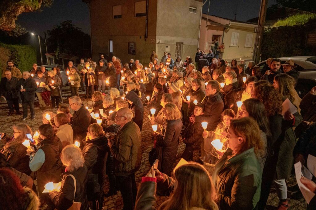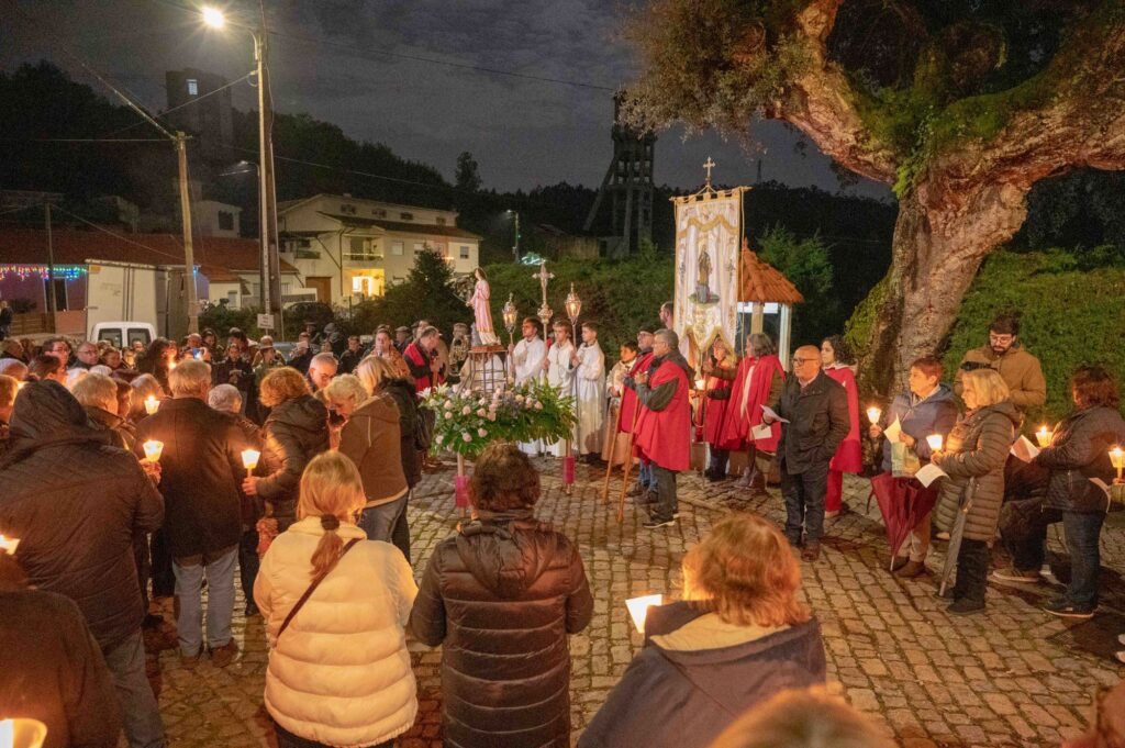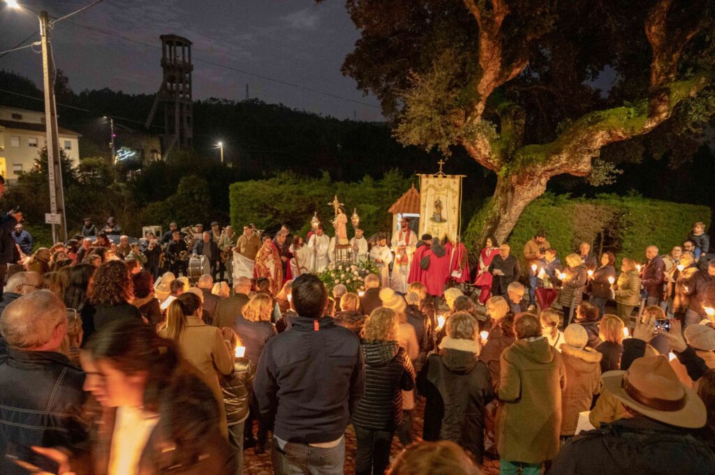 A procissão foi iluminadas pelas velas e por um dos símbolos da identidade mineira, o gasómetro, luz que iluminava os mineiros no interior da mina.
